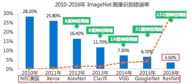 技術(shù)驅(qū)動階段集中誕生了基礎(chǔ)理論、基本規(guī)則和基本開發(fā)工具。在此階段,算法和計算力對AI的發(fā)展起到主要推動作用?,F(xiàn)在主流應(yīng)用的基于多層網(wǎng)絡(luò)神經(jīng)的深度算法,一方面不斷加強(qiáng)從海據(jù)庫中自行歸納物體特征的能力,一方面不斷加強(qiáng)對新事物多層特征提取、描述和還原的能力。對算法來說,歸納和演繹同樣重要,最終目的是提高識別效率。最新ImageNet測試結(jié)果顯示,AI錯誤率低達(dá)3.5% ,而人類對同一數(shù)據(jù)庫識別錯誤率在5.1%,理想情況下,計算機(jī)圖像識別能力已超越人類。